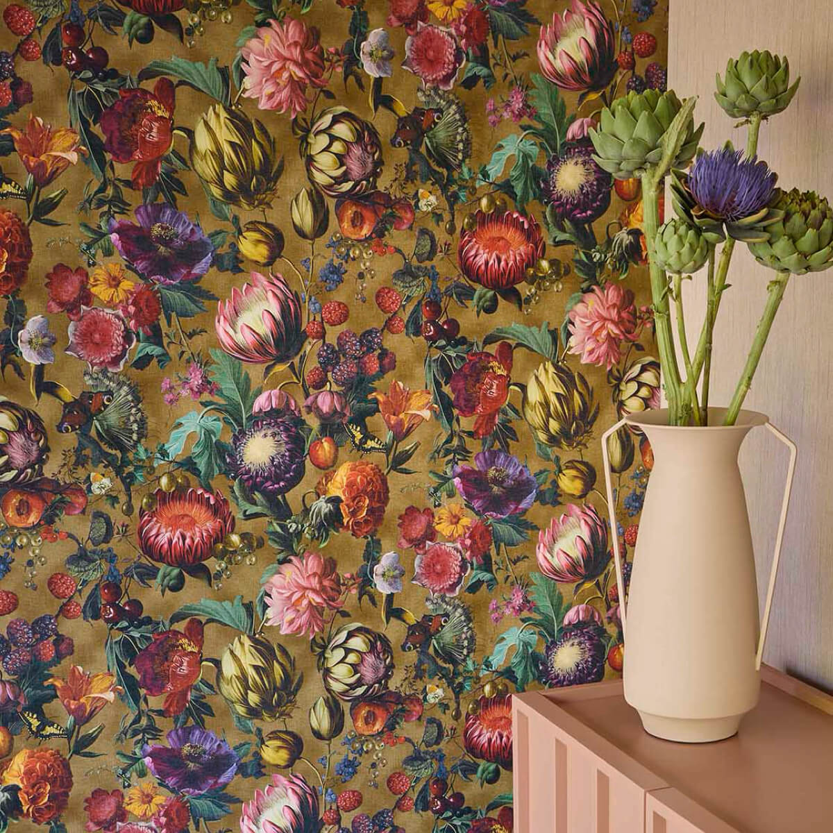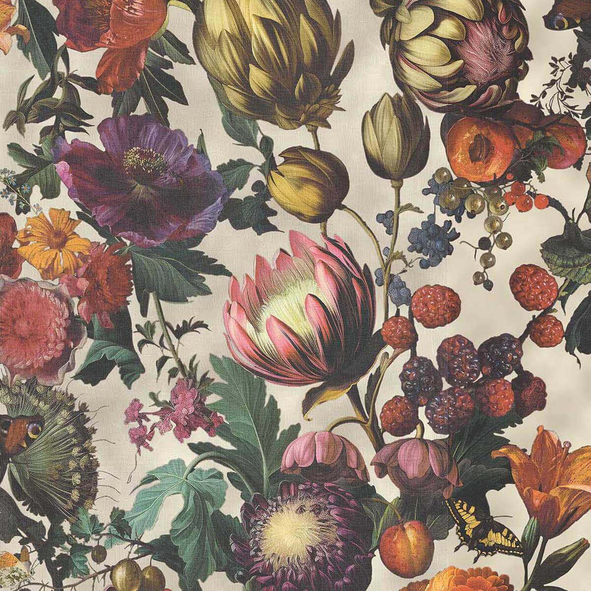 Eijffinger Magnifique toont een uitbundig botanisch tafereel waarin bloemen, vruchten en bladeren zijn samengebracht tot een rijke, schilderachtige compositie. Het dessin is geïnspireerd op klassieke stillevens en natuurstudies uit de zeventiende eeuw, maar krijgt door de losse compositie en het gelaagde kleurgebruik een eigentijdse uitstraling. De verfijnde detaillering en subtiele schaduwwerking geven het oppervlak een bijna handgeschilderd karakter.