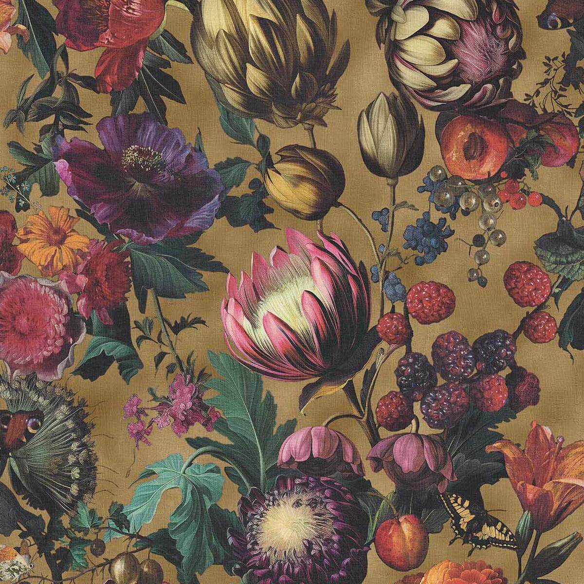 Eijffinger Magnifique toont een uitbundig botanisch tafereel waarin bloemen, vruchten en bladeren zijn samengebracht tot een rijke, schilderachtige compositie. Het dessin is geïnspireerd op klassieke stillevens en natuurstudies uit de zeventiende eeuw, maar krijgt door de losse compositie en het gelaagde kleurgebruik een eigentijdse uitstraling. De verfijnde detaillering en subtiele schaduwwerking geven het oppervlak een bijna handgeschilderd karakter.