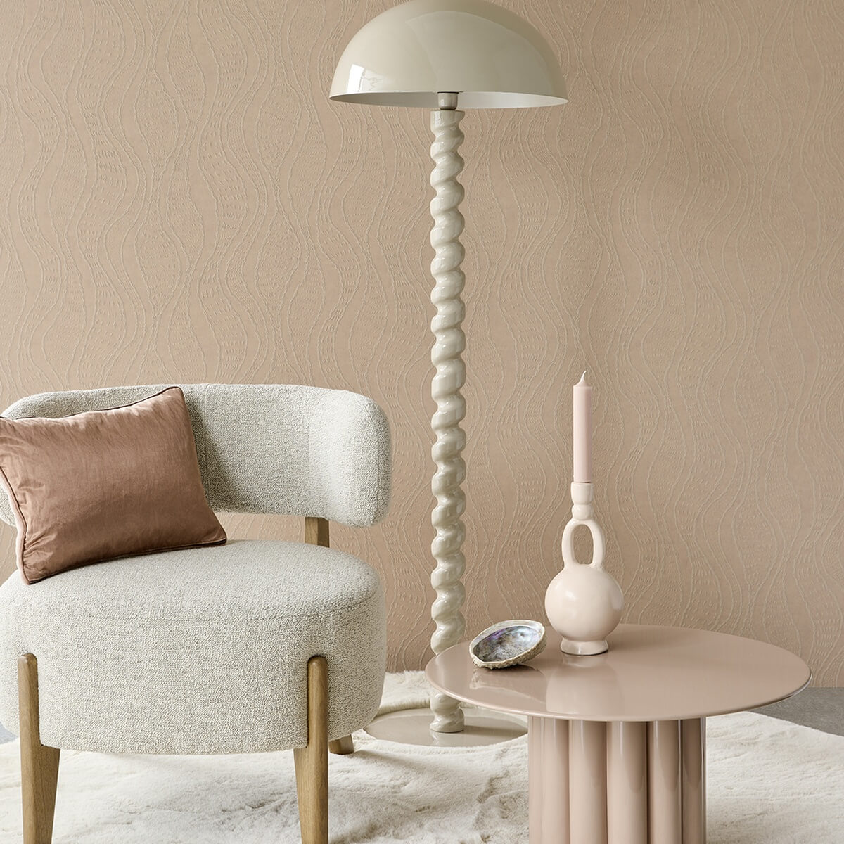 In wit krijgt dit meanderende dessin een frisse en serene uitstraling. De zachte lijnen komen subtiel naar voren en benadrukken de rustgevende werking van het patroon. Deze variant is ideaal voor slaapkamers, woonkamers of hallen waarin licht en ruimte centraal staan. Combineer met lichte houtsoorten, minimalistische meubels en zachte stoffen voor een elegante en moderne sfeer. Het behang vormt een veelzijdige en tijdloze basis die elegantie en rust toevoegt aan elk interieur.