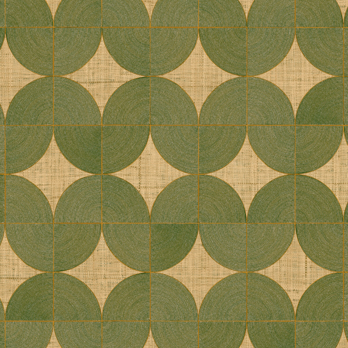 Dit behang combineert geometrische precisie met een natuurlijke textuur, waardoor een verfijnde en eigentijdse uitstraling ontstaat. De cirkelvormige patronen, opgebouwd uit fijn gewikkeld touw, creëren een speels en harmonieus ritme op de muur.